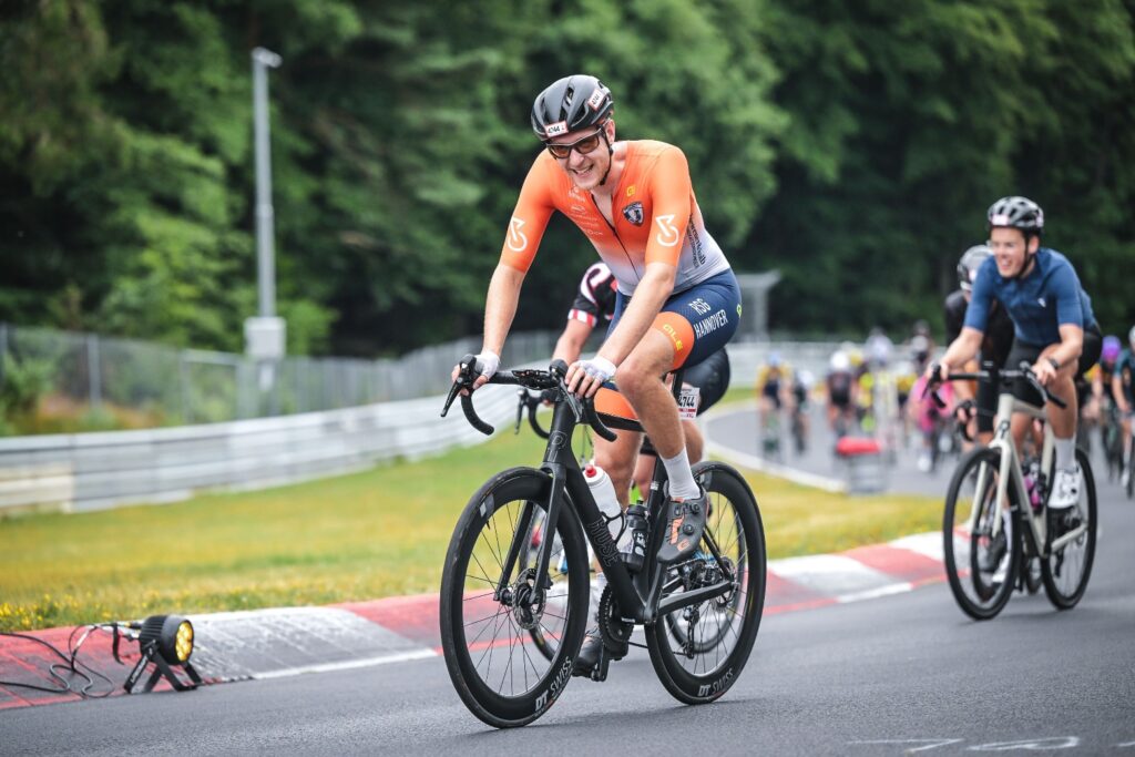 Die erste fliegende Übergabe der Transponder-Flasche an Simon klappte noch nicht ganz perfekt, doch es blieben noch rund 23 Stunden zum Üben – in denen wir konsequent jede Runde wechseln wollten, um ein optimales Ergebnis zu erzielen. Auch Simon meisterte seine erste Runde durch die grüne Hölle im nach wie vor hektischen Renngeschehen mit Bravour. Mit starken 36,8 km/h im Durschnitt konnte er uns weiter aus dem Hauptpulk der 24-Stunden-Teams lösen, sodass er Felix eine gute Ausgangsposition verschaffte, die dieser wiederum an unseren vierten Fahrer Julius weitergeben konnte. Bei den zahlreichen Wechseln wurden wir tatkräftig von unseren beiden Helfern Eric und Stefan unterstützt.