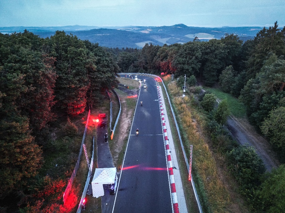 Mit Einbruch der Dunkelheit zog ein kurzer Regenschauer über die Strecke. In Anbetracht des unberechenbaren Eifelwetters hatten wir uns zwar auf nahezu alle Witterungslagen (außer Schnee) vorbereitet, doch zum Glück blieb es bei einem kurzen Schauer und leicht feuchter Fahrbahn. Zwar geriet das ein oder andere Hinterrad kurz ins Schlingern, doch alles verlief ohne Folgen – und wir konnten unsere gute Platzierung mit in die Nacht nehmen.