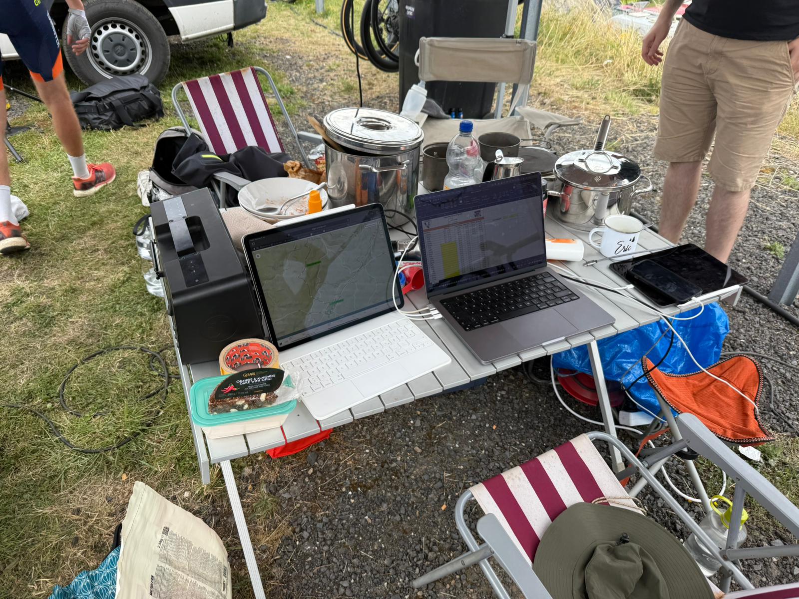 Über unsere Kommandozentrale mit Positionsdaten und Zeitplan prognostizierten sie, wann der nächste Wechsel voraussichtlich erfolgen würde, weckten bei Bedarf den nächsten Fahrer, halfen in die richtige Kleidung, bereiteten das Rad mithilfe einer eigens erstellten Checkliste vor und begleiteten es zum Wechselpunkt. Zwischen den Runden versorgten sie uns zuverlässig mit Tee, Nudeln, Müsli, Keksen und aufmunternden Worten – und trugen damit maßgeblich dazu bei, dass wir stets fit und pünktlich zum Wechsel bereitstanden.